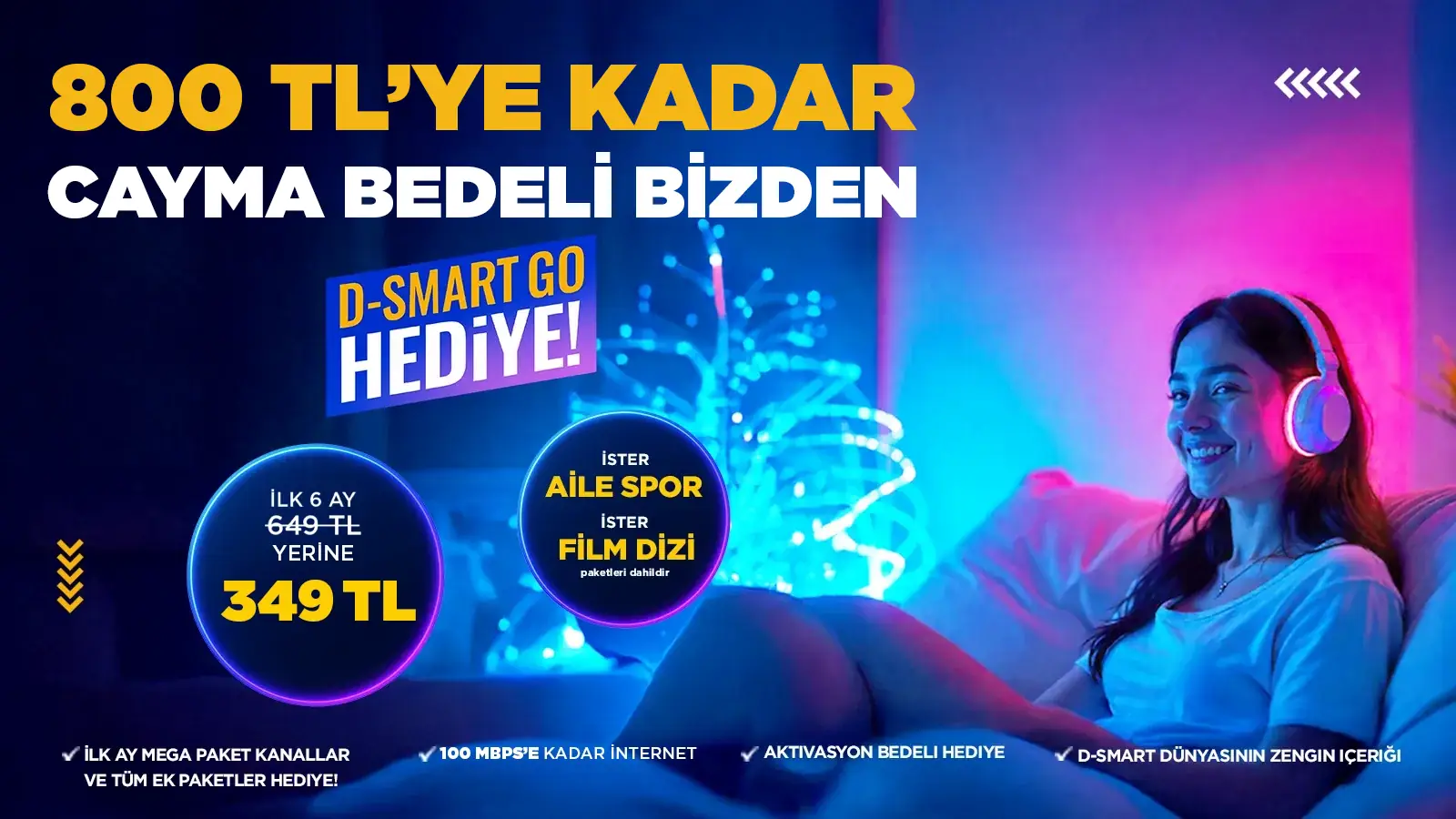 İlk 3 ay indirimli fiyat avantajı! Limitsiz internet, D-Smart GO hediye, ister Aile Spor, ister Film & Dizi paketi dahil. 800 TL’ye kadar cayma bedeli bizden!
